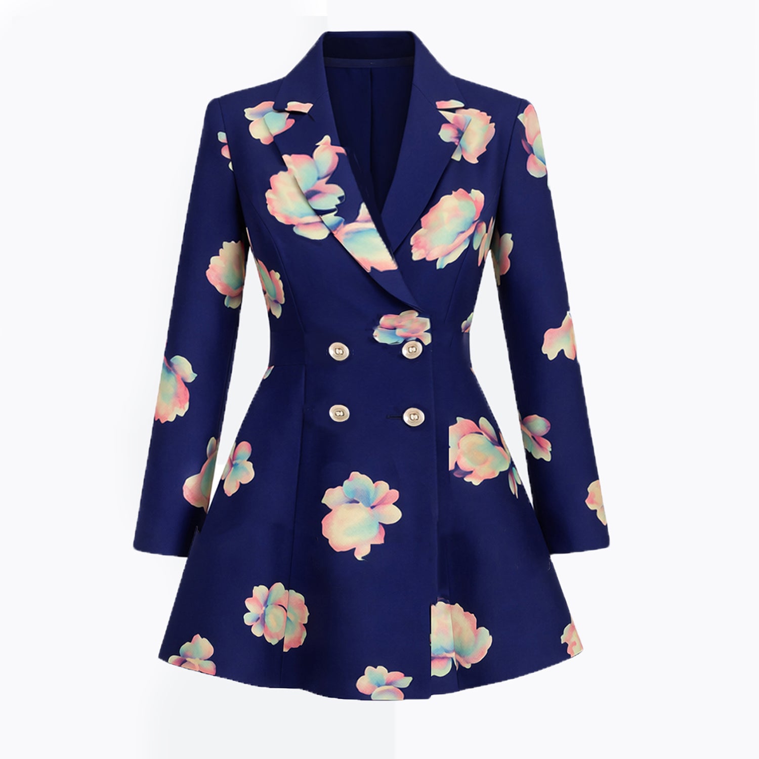 Luxury Handmade Navy Floral Blazer Dress - Tailored Double-Breasted Silhouette