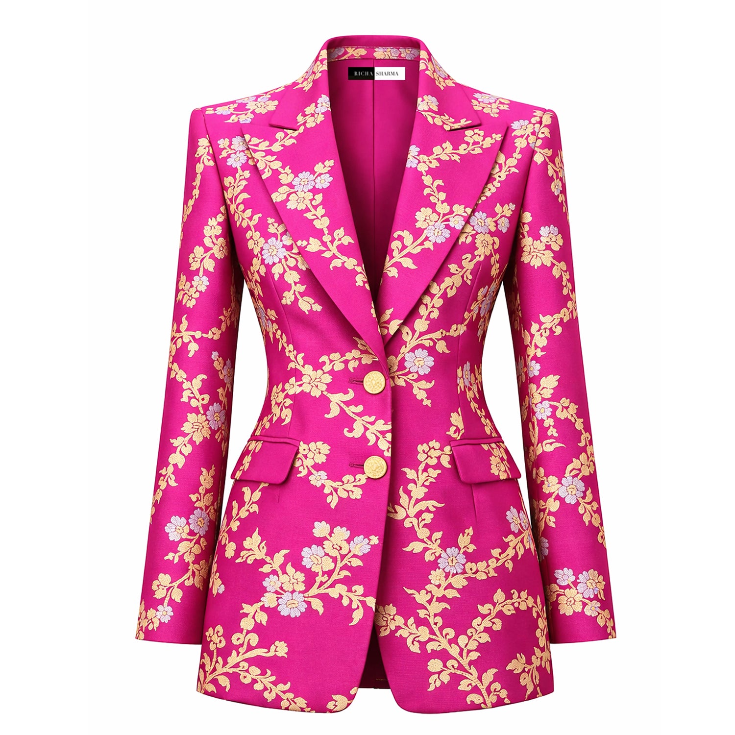 Elevate your wardrobe to this Luxury Handmade Brocade Blazer in Pure Silk, metiulously tailored to create a powerful yet feminine silhouette. Crafted from rich pink silk brocade, the jacket is adorned with an intricate gold floral motif, inspired by heritage craftsmanship and re-imagines through contemporary design.