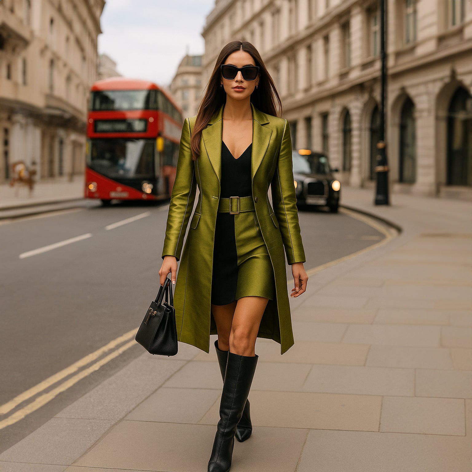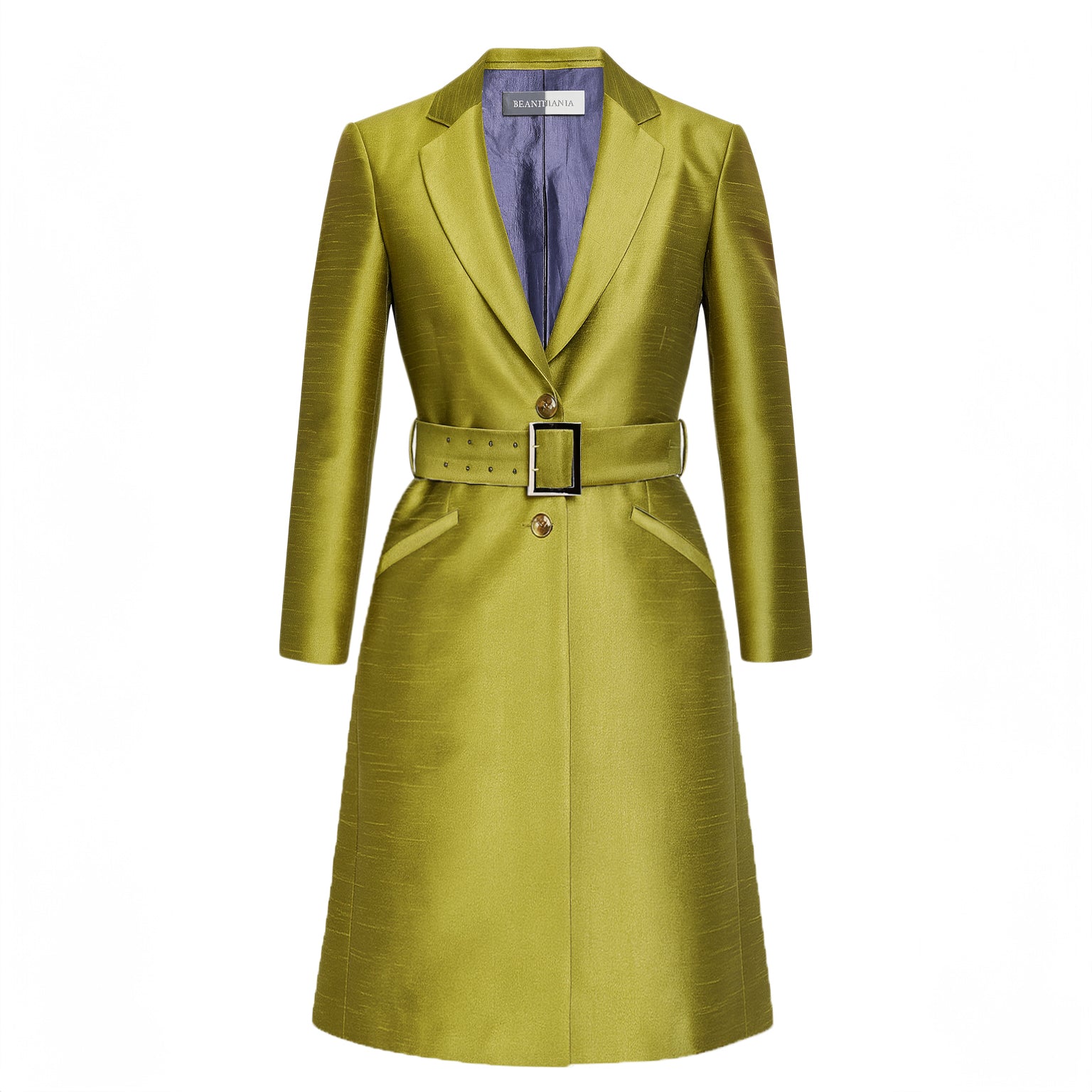 Featuring a sculpted silhouette, sharp notched lapels, and a wide statement belt, the coat cinches elegantly at the waist flattering the silhouette while maintaining effortless poise. The silk lined interior ensures comfort and a flawless drape, while the hand-finished detailing speaks of exceptional craftsmanship and attention to quality.